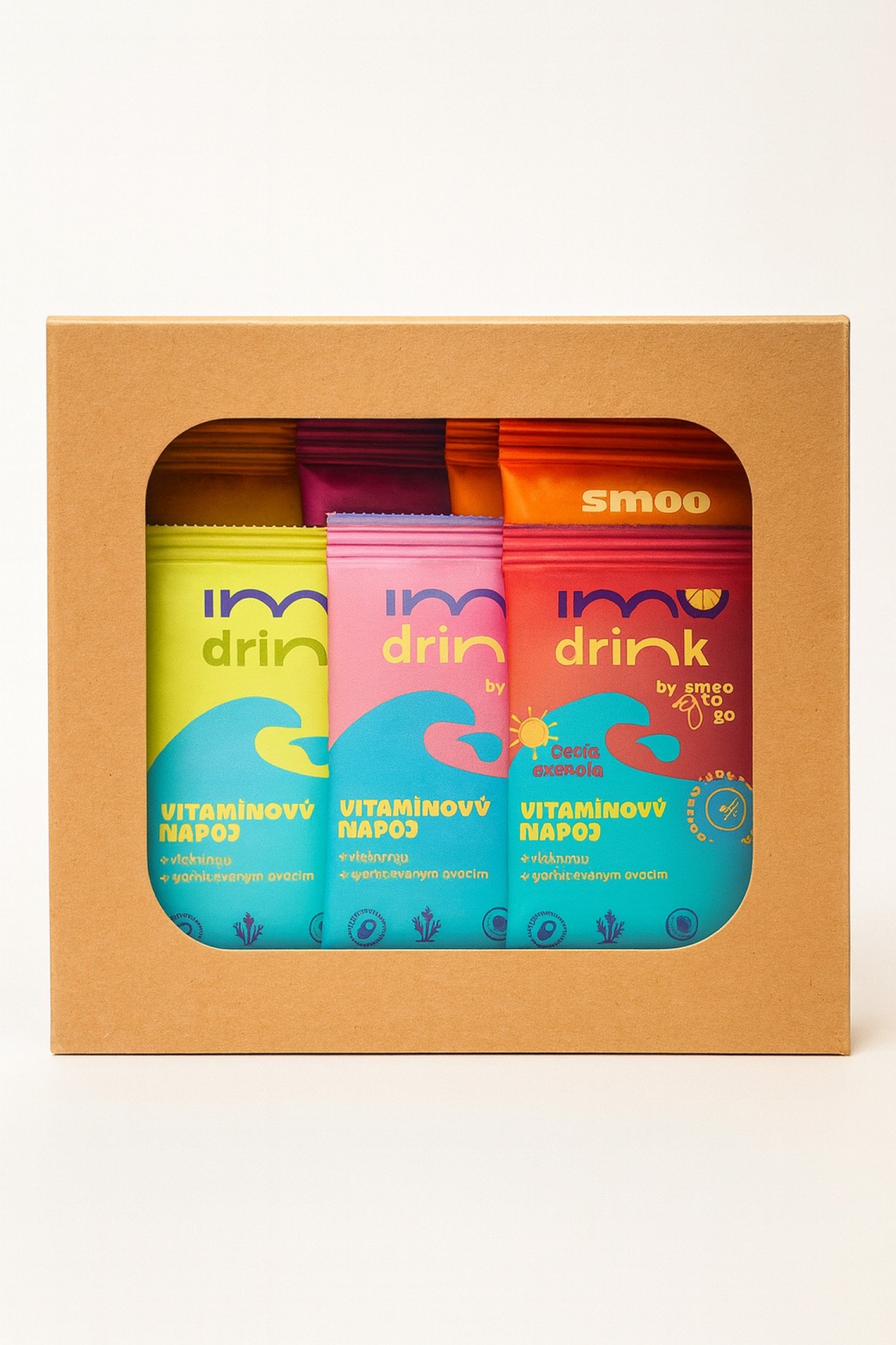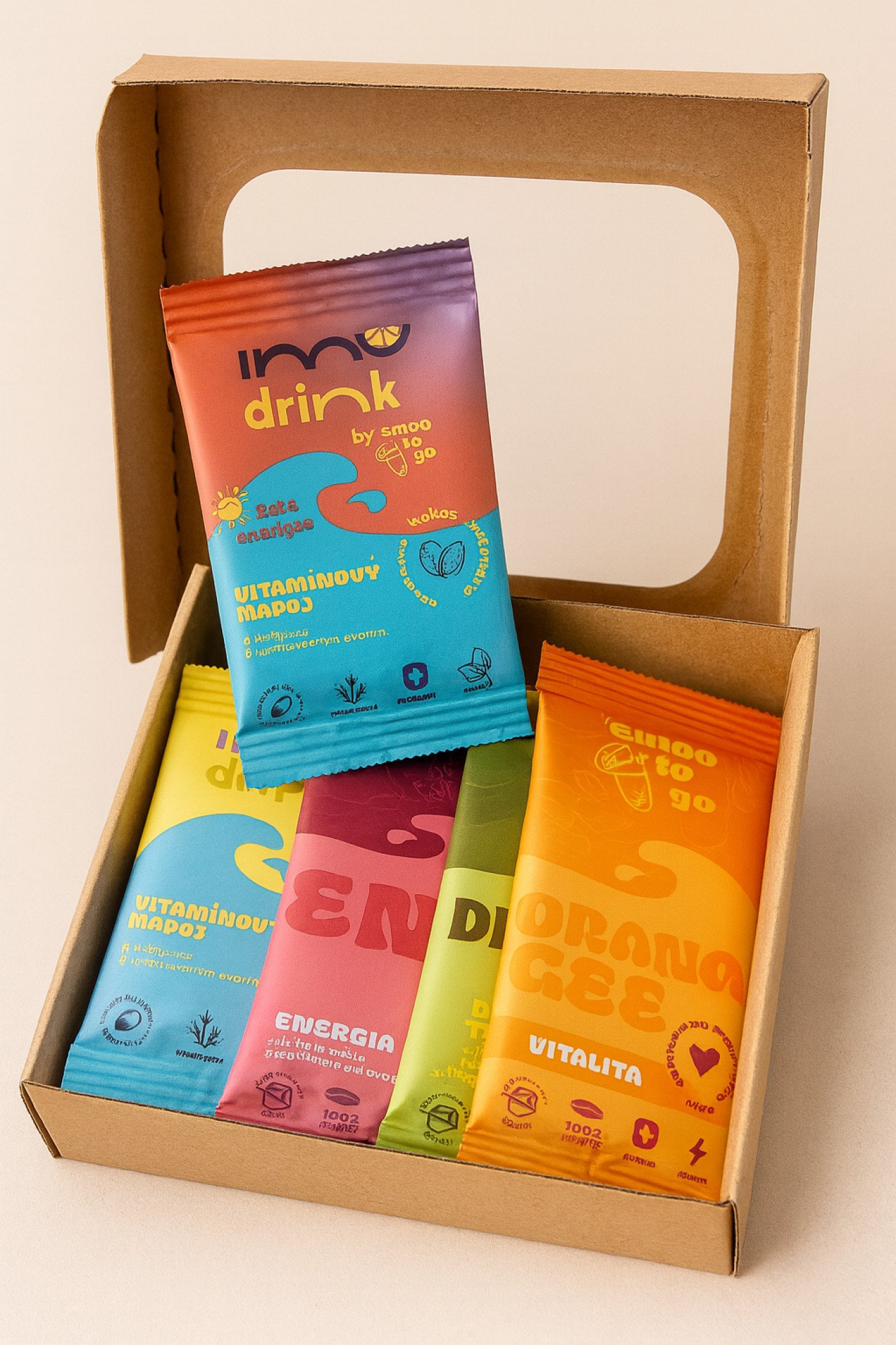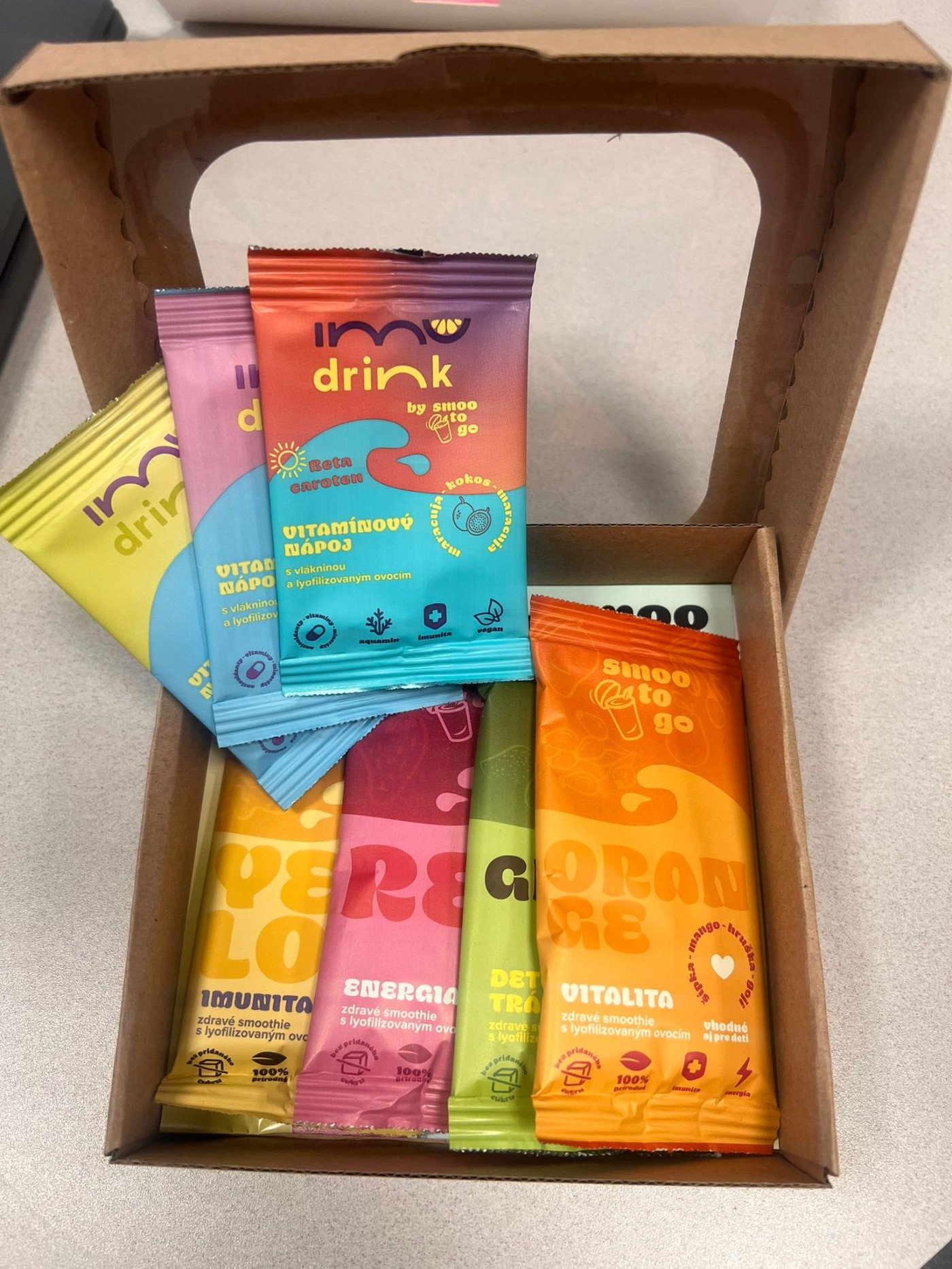 V tomto špeciálnom balíčku nájdeš 8 lyofilizovaných smoothie SMoo to go a praktický šejker,